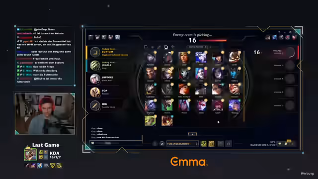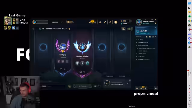 00:10:43Das Thema World of Warcraft wird angesprochen, wobei die extreme Commitment von Spielern kritisch betrachtet wird. Es wird als geisteskrank angesehen, wenn sich Spieler über Wochen täglich 14 Stunden ins Spiel stürzen, da dies schnell an die Substanz geht. Danach wechselt der Fokus zum League of Legends Ranked-Modus. Das Ziel ist, bis zum ersten Prime-League-Spiel am nächsten Wochenende den Aufstieg in den Master-Rang zu erreichen. Der Streamer befindet sich sehr nah an diesem Ziel und ist zuversichtlich, es heute zu schaffen, was seine Motivation steigert.