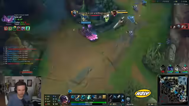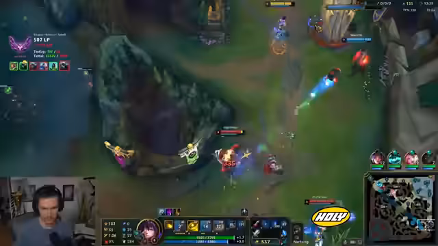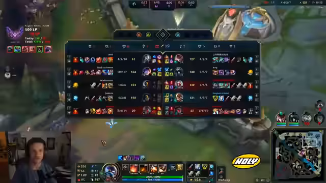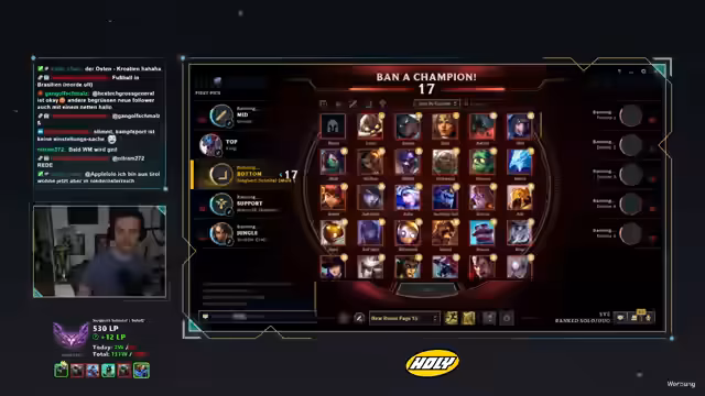 00:00:39Nach längerer Pause ohne SoloQ wird der Stream mit dem Ziel gestartet, den Champion-Pool wieder aufzufüllen. Anstatt auf vertraute Picks wie Ezreal und Corki zu setzen, sollen heute stärkere und aktuellere Champions gewählt werden. Das erste Spiel beginnt mit Ash und Seraphine auf der Bot-Lane, wobei der Fokus auf einer soliden Lane-Phase und effektiver Map-Kontrolle liegt. Zunächst wird ein gutes Early-Spiel gezeigt, das jedoch durch einen fatalen Fehler bei einem Recall im Mid-Game zunichtegemacht wird, was zum Verlust des Spiels führt.