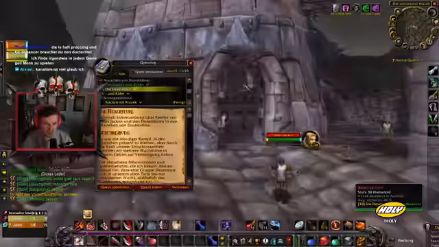 03:28:48Der Stream startet mit der Vorbereitung für eine neue Quest, bei der der Streamer drei Mobs bekämpfen möchte. Er äußert Bedenken, da sein Vanish-Spell auf Abklingung ist und die Gegner, insbesondere zwei Spinnen mit 1.500 Leben, als nicht sonderlich stark eingeschätzt werden. Die Suche nach einem geeigneten Ziel, wie einem Raptor mit 1.400 Leben, gestaltet sich jedoch schwierig. Während der Auseinandersetzung mit den Mobs kommt es zu Problemen mit der Questanforderung, die nicht korrekt gezählt wird, was den Streamer frustriert. Das Inventar ist zudem voll, was die weitere Nutzung von Loot einschränkt.