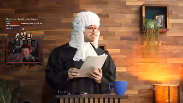 00:53:40Nach der Anklage folgt die Verteidigung. Sie argumentiert, dass Chefstrobel ein absoluter Anfänger ist und dass ihm in der Paniksituation der Vorsatz gefehlt habe. Um die Situation aus einer neutralen Perspektive zu bewerten, wird der internationale Streamer Mr. Grubby als Sachverständiger zugeschaltet. Nach Betrachtung des Beweisvideos erklärt Mr. Grubby, aus seiner unbefangenen Sicht, dass die Missachtung des Levelunterschieds durch die Gruppe der eigentliche Fehler sei, nicht das Verhalten des Schurken in der Notsituation. Die Argumente beider Seiten werden präsentiert und diskutiert.