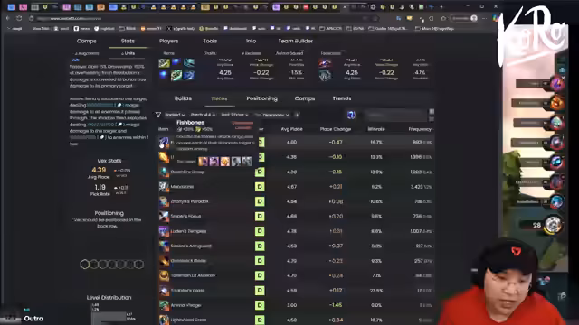 01:27:45Der Streamer erkundigt sich im Chat nach Fragen zur neuen Patch-Version und sucht den Meta-TFT-Guide. Nach anfänglicher Verwirrung, warum die Regionsfilter nicht mehr funktionieren, stellt er fest, dass er nicht bei Meta-TFT eingeloggt war. Nach dem Login nutzt er den Itemassistenten, um Kompositionen, beste Platzierungen, durchschnittliche Platzierungen und abgeschlossene Items zu analysieren. Er testet den Assistenten mit seinen Items, wie Breaker, Sunfire und Guinsoo's, und ist beeindruckt von der Funktion, die ihm ermöglicht, Itemvervollständigungen zu finden und seine Item-Effizienz zu optimieren.