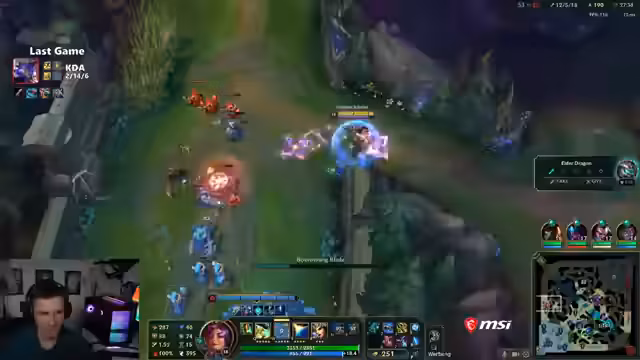 01:51:07Im späten Game ist der Elder Dragon aktiv und entscheidend. Das Team versucht, den Nashor zu nehmen, was als riskant erachtet wird. Der Streamer kritisiert den Versuch als 'terrible Call'. Er sieht sich gezwungen, den Elder von weitem mit seinen Abilities zu bekämpfen, was sich frustrierend anfühlt. Am Ende gewinnt das gegnerische Team durch einen schmalen Vorsprung, was den Streamer als krank und unfair beschreibt, da er das Gefühl hatte, nichts mehr tun zu können und von den spielerischen Besonderheiten des Gegners (Aurelion Sol) aus dem Spiel gehalten worden zu sein.