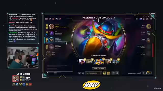 02:12:48Nach der Hardware-Präsentation ging der Streamer wieder ins Spiel, eine Duo Queue in League of Legends. Dabei wurden technische Details wie die Einstellung der Systemzeit von Amsterdamzeit auf die lokale Zeit erwähnt. Das Spiel startete, und während des Ladebildschirms wurde eine Elo-Begrüßung ausgetauscht. Der Streamer kommentierte die anfänglichen Spielzüge und den Zustand der Lanes.
