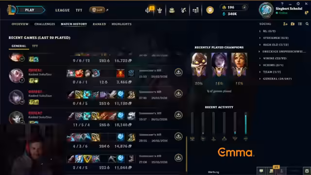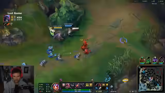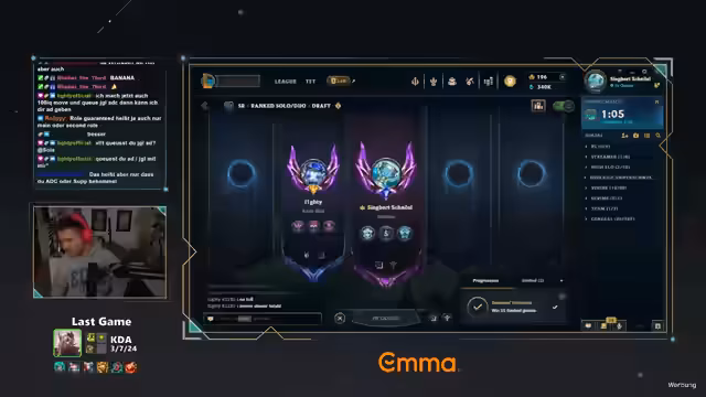 05:21:16Nach einem weiteren verlorenen Spiel mit Corki als ADC, das er als 'Arschgame' bezeichnet, zieht der Streamer eine persönliche Bilanz der aktuellen Season. Er beschreibt ein extremes Extrem: Spiele, in denen er als ADC alles kontrolliert, und solche, in denen er sich völlig ohnmächtig fühlt. Er zieht den Schluss, den Champion Kaiser vorerst nicht mehr zu spielen, da sich dieser unplaybar und fehleranfällig anfühlt, und blickt auf die erreichte Elo.