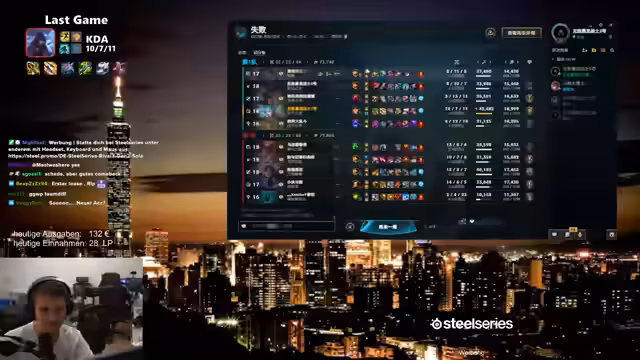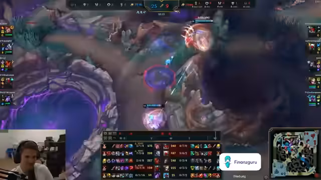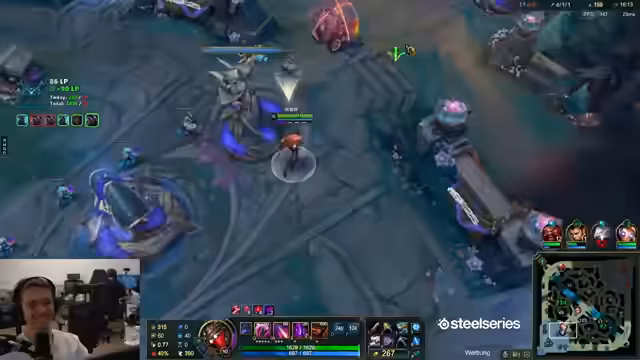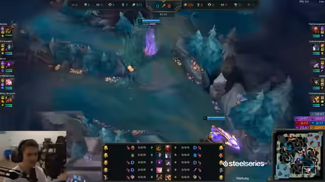00:05:23Nach einer längeren Durcharbeitungsphase von über zehn Tagen kündigt der Streamer eine Erholungspause an und meldet sich auf dem China-Server an. Die Wartezeiten für das Ranked-Spiel sind ungewöhnlich lang, was auf technische Probleme mit dem China-Server zurückgeführt wird, in Anlehnung an den chinesischen Tag der Arbeit. Nach einer Lobby-Aufstieg von Platin zu Diamant wird der Champion Draven mit der Bot-Lane-Kombination Aphelios gewählt. Das Spiel gestaltet sich schwierig, da der Gegner einen Level-3-Gank startet und der Streamer sich überfordert zeigt. Er stellt fest, dass das Spielen alleine im Vergleich zu Duo-Queue einen erheblichen Unterschied macht, da man sich nicht mehr auf einen verlässlichen Anker im Team verlassen kann.