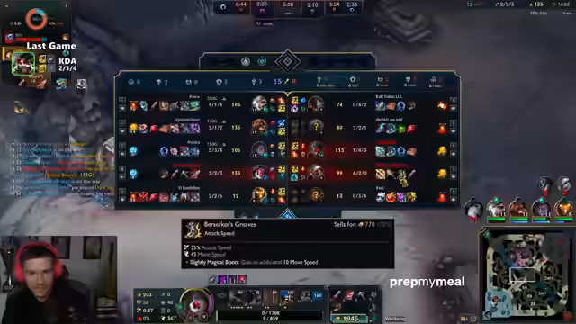 01:49:47Der Streamer analysiert das aktuelle Spiel und stellt fest, dass MF gegen Aphelios nicht ideal ist, aber durch Sustain (z.B. mit Bloodthirster) Trades nehmen kann. Er lobt die Skarner-MF-Kombination und fragt sich, ob der Skarner-Support bewusst wegen MF gepickt wurde. Er äußert Zweifel an der Effektivität von TCGs im westlichen Markt und vermutet, dass sie in Asien besser laufen. Der gegnerische Aphelios wird als 'One-Shot' beschrieben, weil er Full-AD geht, anstatt Rüstung oder HP zu kaufen. Der Skarner-Pick wird als 'useless' bezeichnet, da er ebenfalls Full-AD spielt, was für einen Tank-Support keinen Sinn ergibt. Die Toplane ist komplett offen, und die Midlane steht 0-4. Der Streamer beklagt die Leistung von Seraphine (0-5-0) und die scheinbar unspielbare Situation. Er glaubt, dass das Spiel noch gewinnbar wäre, wenn Seraphine normal spielen würde, aber sie 'intet' digital und ist AFK, was das Spiel 'unwinnable' macht. Er vermutet, dass Seraphine entweder Elo-boosted ist, eine Losing Streak hat oder ein Support-Main ist.