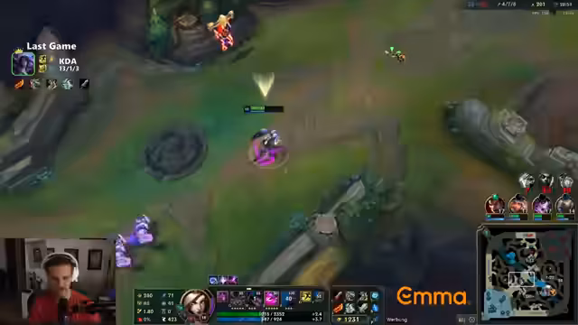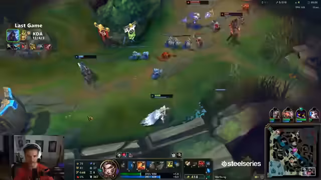 00:13:27Ein Spiel gegen einen Blindpick-Olaf wird als extrem herausfordernd beschrieben. Der Champion wird als „fucking broken“ und „unpeelable“ eingestuft, was die Teamkombination massiv erschwert. Das Gameplay geprägt von defensivem Verhalten, um dem gegnerischen Top-Laner aus dem Weg zu gehen. Trotzdem gelingt es dem Team, das Game nach mehreren Fights und klaren Makro-Fehlern der Gegner zu gewinnen.
