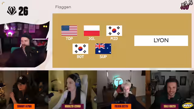 02:47:13Es folgt ein Quizabschnitt, in dem den Teams fünf Flaggen von Ländern vorgelegt werden. Ihre Aufgabe ist es, das entsprechende LoL-Team zu identifizieren. Die Teams stammen aus existierenden Ligen wie der LEC, LCK und LPL. Diese Kategorie erfordert von den Teilnehmern Wissen über aktuelle Spielerkompositionen und die Nationalität der Profis in der电竞-Szene.