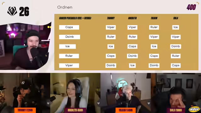 01:43:21Die Teilnehmer mussten Profispieler wie Skliment, Honkyu, Inspired, Ruler und Hans Sama nach ihrem Alter ordnen. Ruler erwies sich mit 28 Jahren als der älteste der Gruppe, was für seinen langen Karriereweg als überraschend empfunden wurde, da man ihn älter geschätzt hatte.