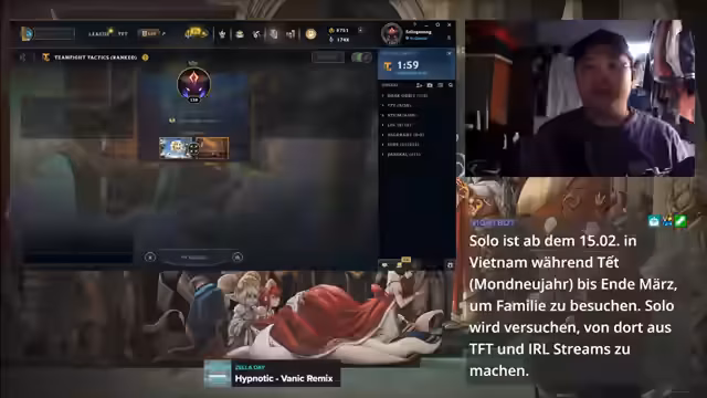 Ein unregelmäßiger Stream aus Vietnam geprägt von persönlichen Eindrücken einer Reise zur Familie. Im Mittelpunkt steht die Analyse des TFT-Metas mit den starken Comps Junara und Slayers. Es wird über Pläne für spontane Streams vor Ort sowie eine mögliche Kooperation mit lokalen Spielern diskutiert.