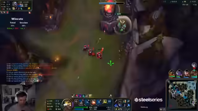 00:53:34Das League-Spiel verläuft für den Streamer katastrophal, er stellt fest, dass sein Champion in dieser Konstellation unspielbar sei. Er fühlt sich von seinem Team im Stich gelassen und macht Fehler wie das zu frühe Pushen ohne Sicherheit. Nach der verlorennen Partie wird der Fokus auf die missglückte Dark Souls-Szene gelegt. Er analysiert den Tod am Black Knight nochmals und stellt fest, dass er kein Alleingänger sei, da auch andere wie Kutscha und Max an dieser Stelle scheiterten.