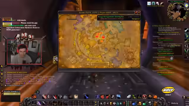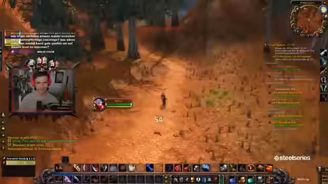 01:17:31Nach den externen Themen kehrt der Streamer zum Spielen zurück. Er befindet sich in Desolace und sucht nach den richtigen Wegen für Quests. Er versucht, einen der gefallenen Gildenmitglieder zu erwähnen, stirbt aber kurze Zeit später in der selben Gefahrenzone. Dies unterstreicht die konstante Bedrohung im Hardcore-Modus und endet mit einem zukünftigen Neuanlauf.