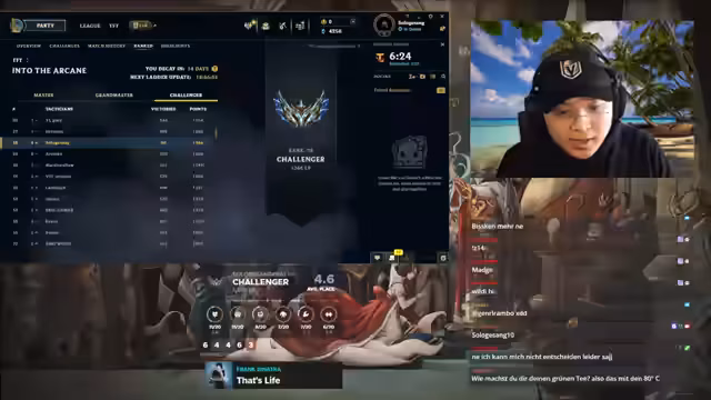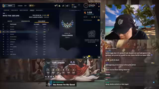 00:05:55Zu Streambeginn spricht der Streamer mit dem Chat über seine Absicht, den Rang 1 in Nordamerika zu erreichen. Er analysiert mögliche Kombinationen für seine Runde und erwähnt Champion-Kategorien wie Visionary, Quickstriker und Sorcerer. Er debattiert kurz, ob er Emissary oder Form Swap spielen soll, bevor er sich für einen Sorcerer-Emissary mit Strike-Rolle entscheidet. Der Fokus liegt auf dem Aufbau einer Win Streak und der Platzierung in der Top 10, wobei er 1494 LP benötigt.