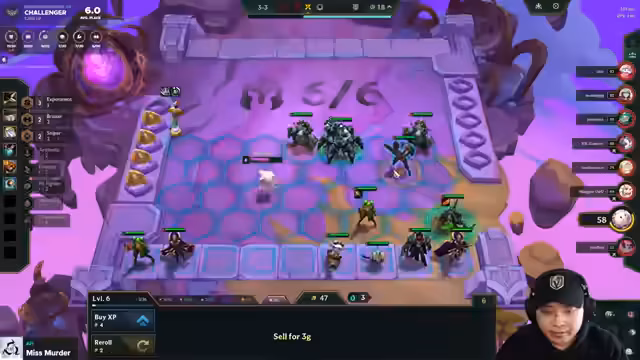03:23:52Der Streamer passt seine taktische Herangehensweise an die veränderten Spielumstände an. Er evaluiert das Matchup und schaut sich die Synergie-Icons an. In einem Spiel entscheidet er sich für eine 3-Rebels-Kombination mit Mel und Bulky Buddies, obwohl dies bedeutet, wichtige Einheiten wie Elise zu opfern, um den Verlust an HP und Stats zu minimieren.