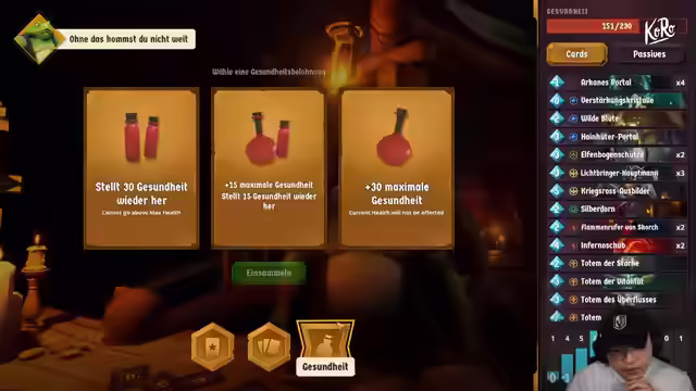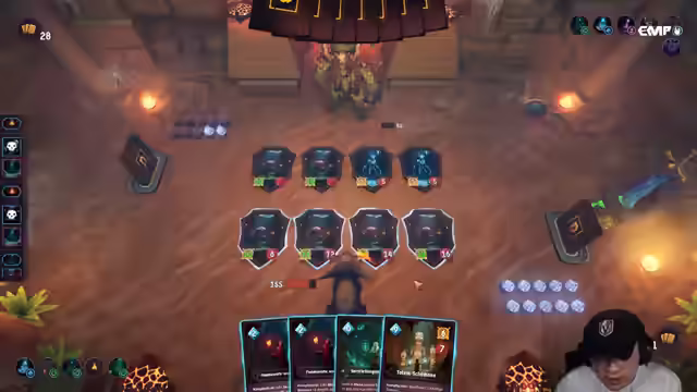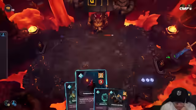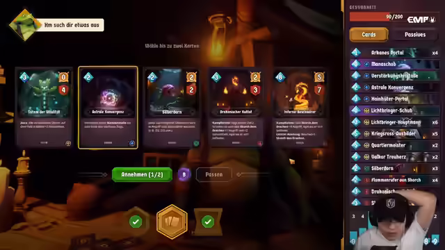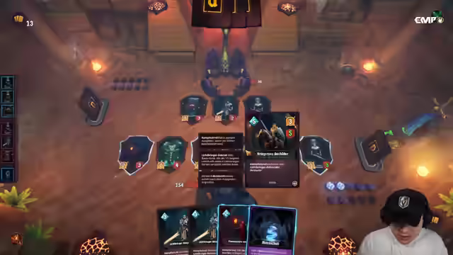 08:27:05Es wird ein Licht-Deck im Spiel ausprobiert, wobei die passiven Fähigkeiten des Decks eine wichtige Rolle spielen. Die passiven Fähigkeiten ähneln Items und ermöglichen es, bis zu zwei Karten auszuwählen und einen leeren Manakristall zu erhalten. Der Inferno-Schub wird als extrem gut angesehen. Es werden verschiedene Kartenkombinationen und Spielzüge diskutiert, einschließlich des Einsatzes von Totems und Lichtbringer-Rekruten. Es werden Strategien entwickelt, um die Monster zu töten, ohne dass die eigenen Einheiten sterben. Das Spiel erfordert es, die Totems des Gegners zu zerstören, um dessen Effekte zu neutralisieren. Es wird festgestellt, dass Machtkarten sehr stark sind, aber nur einmalig eingesetzt werden können. Es wird überlegt, welche Karten zerstört werden sollen, um das Deck zu optimieren, wobei das Zerstören von Arcanus-Portalen in Betracht gezogen wird. Es wird das Ziel verfolgt, ein dünneres Deck zu erstellen, um die Effizienz zu erhöhen. Es wird festgestellt, dass es wichtig ist, genügend Karten im Deck zu haben, um nicht ohne Karten dazustehen.