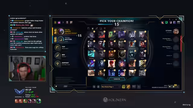 02:15:57Nach einem Jax-Ban im Spielausschnitt muss die Champion-Auswahl neu bewertet werden. Es werden AD-Bruiser im Jungle wie Wukong, Jarvan und Xin Zhao diskutiert, die als mechanisch simpel beschrieben werden. Für den Botlane-Support werden Winter-Skin-kompatible Helden wie Braum und Sona bevorzugt. Der Streamer reflektiert über seine Jungle-Grundlagen nach 15-20 Spielen und betont die Wichtigkeit von Champion-Mechanik und Farm-Rhythmus.