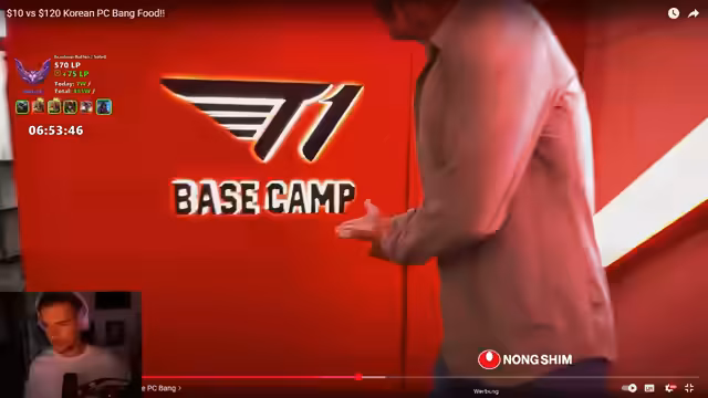 08:39:14Die Losses im Spiel werden analysiert, wobei festgestellt wird, dass die meisten unter 30 Minuten dauern, im Gegensatz zu den Wins, die oft länger sind. Es wird über den Bau von Items diskutiert, wobei Static als das objektiv beste Item angesehen wird. Parallel dazu wird das PC-Bang-Video weitergeschaut, an dem seit Stunden gearbeitet wird. Im Video wird ein PC-Bang in Seoul besucht, das von einem professionellen E-Sport-Team gesponsert wird. Es wird über die angebotenen Speisen gesprochen, darunter koreanische Chicken and Waffles. Es wird erwähnt, dass Faker, ein bekannter Gamer, im PC-Bang anwesend ist. Abschließend wird die Popularität von Sportarten in Korea angesprochen, wobei Fußball und Baseball als sehr beliebt gelten.
