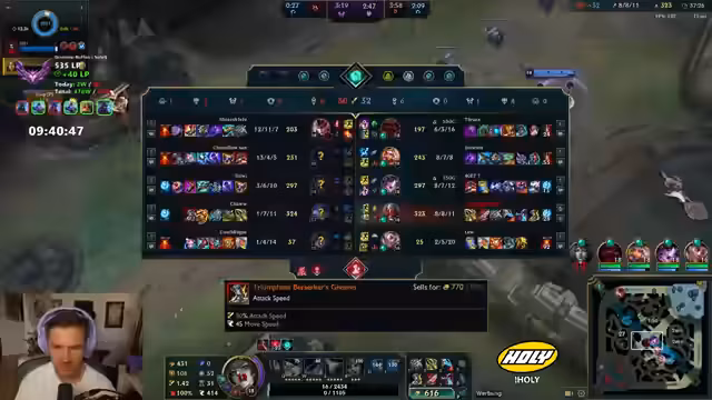 05:09:47Der Streamer kommentiert den Spielverlauf und analysiert seine Item-Builds. Er stellt fest, dass das Spiel solider aussieht, da sie einen gefeedeten Akschan haben. Er warnt jedoch, dass die Riven das Potenzial hat, das Team zu pentakillen. Er fragt sich, warum er links an dem steht und nicht rechts und bezeichnet dies als Inter. Er stellt fest, dass das Game sehr winnend ist, wenn er aufhört zu inten. Er lobt den Akshan als Malora und kommentiert, dass dies der eine Fight war, bei dem Riven das Game hätte carryen müssen. Er plant, LDA als drittes Item zu gehen, um den Ult Damage zu maximieren. Er wiederholt, dass Akschan top ist und bittet darum, nicht zu fighten. Er merkt an, dass alles scary ist und wer wen zuerst one-shotet. Er bedauert, dass er nicht mehr rausgekommen ist und von Einhook insta-dead war. Er glaubt, dass sie weiter brauchen und schade findet, dass der Akschan gestorben ist. Er kommentiert, dass das Spiel sich komisch anfühlt und er nicht richtig drinnen ist. Er pinkt die Mitte Wave 16 Mal und fragt sich, warum keiner da ist. Er glaubt, dass die Riven nur für ihn Ults und er sie nicht facen darf. Er stellt fest, dass er an dem Punkt ist, wo jeder Fighters Game gewinnen oder verlieren kann und er blind ulten kann auf den Kogmar, aber nicht weiß, ob es das wert ist. Er analysiert, dass die Tod nichts war und seine Arbeit pur ist. Er setzt zum finalen Push an und kommentiert, dass dieser eine Autotech von Akshan gerade das Game gewonnen hat. Er stellt fest, dass der Bego die Ult geblockt hat und der Akshan sie auf seinem Rücken hatte. Er bezeichnet den Axtstab als Malocher und kommentiert, dass es tough wird. Er bemerkt, dass die meisten Siege lange dauern, während die meisten Niederlagen schnell vorbei sind.