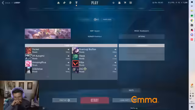 03:10:36Nachdem die technischen Probleme gelöst sind und das Team vollständig ist, geht es um die Wahl des Spielmodus und der Karten. Ein "Deathmatch" wird als Startmodus gewählt, wobei die Regeln, wie der Operator-Wurf, kritisiert werden. Für die nachfolgenden Spiele wie "Ascent" und "Bind" werden die Maps ausgewählt. Es finden kurze Verhandlungen statt, wie viele Punkte ein Sieg in den verschiedenen Modi bringt, bevor mit dem eigentlichen Wettkampf begonnen wird.