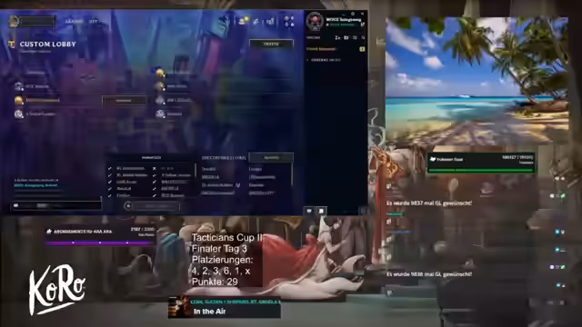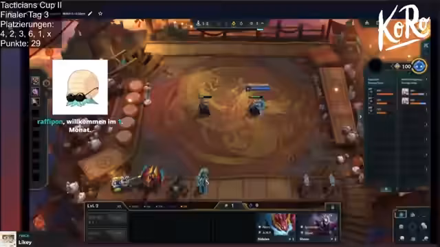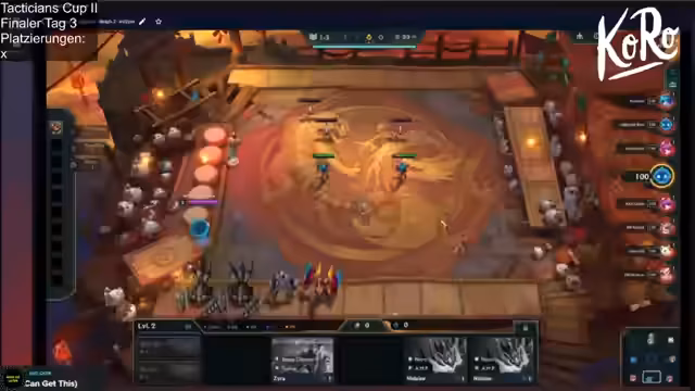 00:02:47Der Stream beginnt mit Ankündigungen zum Turnierfinale des Tacticians Cup, das um 15 Uhr startet. Der Streamer bereitet sich auf das erste Spiel vor und analysiert seinen Opener, bei dem er Kinder und doppelt Scannere gedroppt hat. Er erwägt eine strategische Anpassung, indem er Silas gegen Shyvana eintauscht und pivotiert, um sich den vorteilhaften Nitro-Tempo-Augment zu sichern. Der Fokus liegt auf der richtigen Item-Kombination und der optimalen Positionierung.