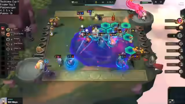 05:23:03Für das allerletzte Spiel des Turniers ist der Streamer hochkonzentriert und prüft alle Optionen. Er ist der letzte verbliebene deutsche Spieler und hat noch die Chance auf den zweiten Platz. Im Spiel pivotiert er zu einer 3-1 Composition mit Elise und Sejuani, setzt alles auf eine hohe Stufe und hat gute Chancen. Leider verliert er das Spiel knapp, was ihm den zweiten Rang kostet, und beendet das Turnier auf dem fünften Platz mit 600 Euro Preisgeld.