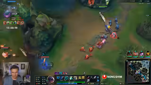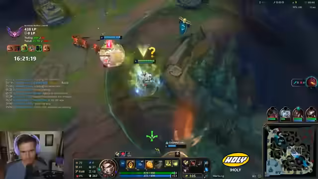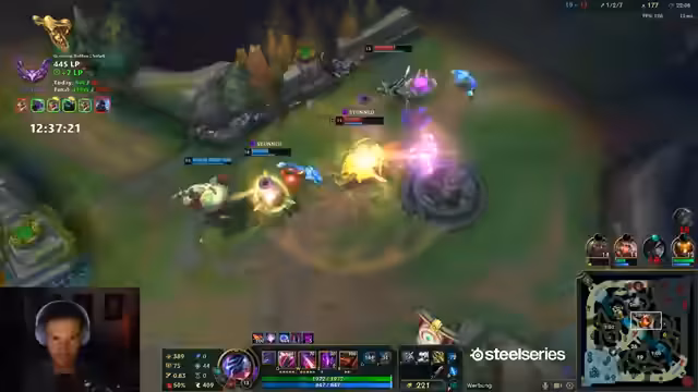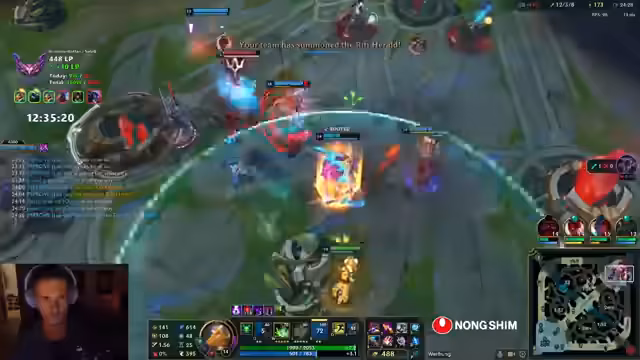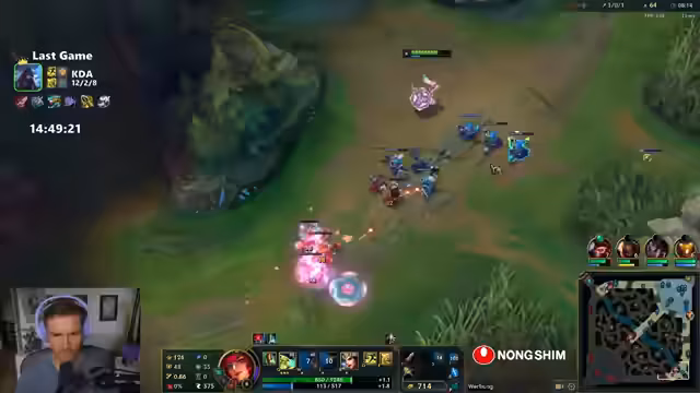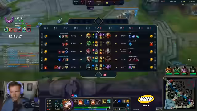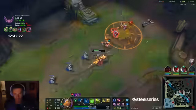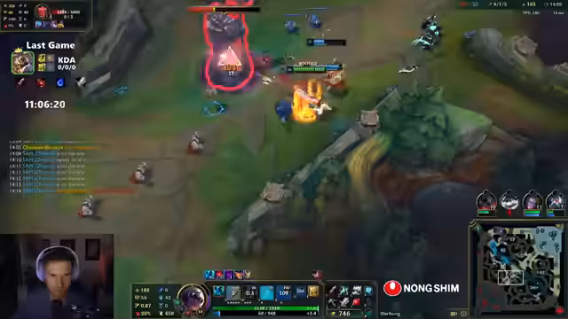 10:12:14Der Streamer äußert Frustration über das Matchup und wird oft outranged. Es wird überlegt, ob der Jungler helfen kann. Der Streamer wird von fünf Gegnern überrascht. Der gegnerische Toplaner wurde schon fünfmal wiederbelebt. Das Team darf nicht mehr mit rein, weil die Gegner immer im Vorteil sind. Der Streamer glaubt, dass Yonah kein Flash mehr hat. Es wird überlegt, ob man den Baron machen soll. Der Streamer muss unten rum und versucht, einen Gegner zu holen. Es wird überlegt, ob man Full Damage oder Bronyas bauen soll. Der Streamer glaubt, dass Sonja hier ist. Das Team spielt die ganze Zeit 1 zu 1, aber respektiert die Mitte nicht. Der Streamer glaubt, dass das Team das Spiel einfach machen könnte, wenn sie einfach 1-4 spielen oder groupen würden. Es wird über Master Yi gesprochen. Der Streamer darf nicht sterben, um Zeit rauszuholen. Die Gegner sind kurz vor Power Spikes. Der Streamer fragt sich, wie man das noch deffen kann.