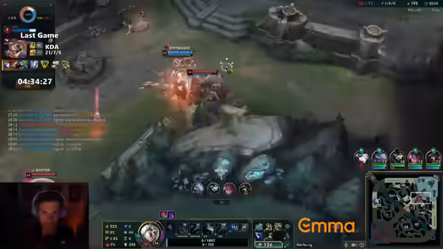 01:35:44Es treten technische Probleme und Missverständnisse im Gameplay auf. Eine Diskussion über die Wahl von Champions wie Ash und deren uninteraktive Spielweise. Der Streamer bemängelt, dass Ash eine langweilige und geisteskrank anmutende Spielweise aufweist, die das Geschehen traurig macht. Es kommt zu kritischen Bemerkungen über das Spielverhalten von Mitspielern, insbesondere die häufigen Fehler und Todesfälle.