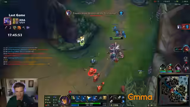 09:12:01Der Streamer kommentiert den aktuellen Spielverlauf und die strategischen Entscheidungen des Teams. Er analysiert die Auswirkungen von verlorenen Türmen und die Notwendigkeit, sich an die veränderte Spielsituation anzupassen. Er diskutiert die Stärken und Schwächen des Teams und die Notwendigkeit, auf bestimmte Champions zu fokussieren. Er reflektiert über vergangene Fehler und wie diese den Gegnern Vorteile verschafft haben. Er analysiert die Item-Builds der Gegner und die Auswirkungen auf ihre Stärke. Er diskutiert die Bedeutung von Teamarbeit und Koordination, um im Spiel erfolgreich zu sein und die Herausforderungen, wenn Teammitglieder nicht synchron agieren.