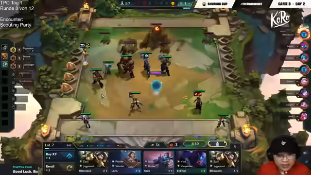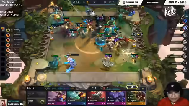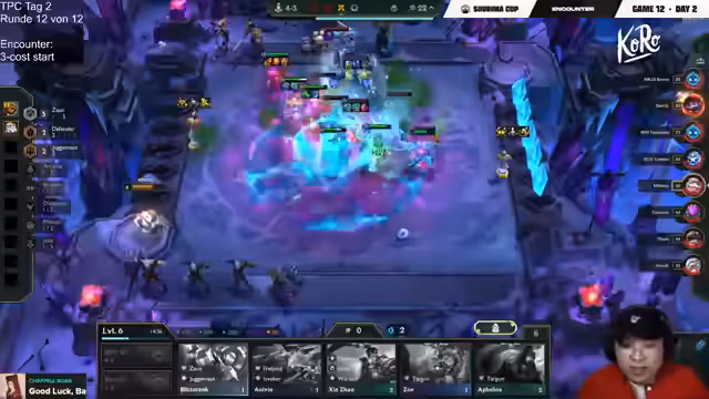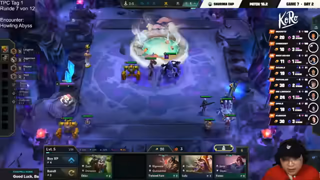 08:02:38Die Runde neigt sich dem Ende zu. Moritz kämpft mit seiner Gangplank-Kombo in einem hart umkämpften Fight. Sein Ziel ist es, Bell'Veth 2 und Gangplank 3 zu finden, um eine konkurrenzfähige Truppe fürs Late-Game aufzubauen. Der Streamer verfolgt die Plätze der verbliebenen Spieler wie Womendeth und Xperion, die ebenfalls ums Überleben kämpfen. Am Ende der Runde qualifizieren sich Raiko, Double Go, Busta und Kubikson direkt fürs Finale. Die restlichen acht Spieler, darunter Moritz, spielen noch zwei weitere Partien, um die letzten vier Plätze zu ermitteln. Das Format des Finales wird als Checkmate-System angekündigt.