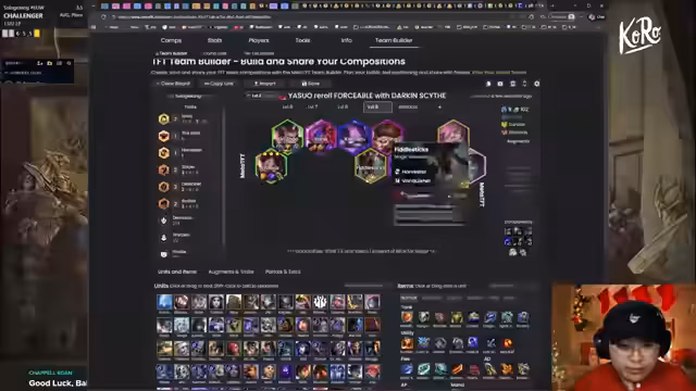 01:38:33Während des Spiels läuft der Streamer auf einige Hindernisse. Er kämpft damit, die richtigen Items wie Sunfire oder Edge of Night für seine Einheiten zu finden und baut stattdessen einen Notfall-Belt-Build. Sein Fokus liegt darauf, die Einheiten Swain und Zoa zu poweren, wobei er Schwierigkeiten hat, eine bestimmte Unit wie Garen zu finden, die für sein Build entscheidend ist.