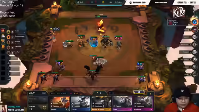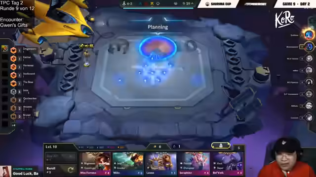 09:22:07Im letzten Game, das über den Turnier-Einzug entscheidet, wird der Druck immens. Moritz benötigt zwingend einen der ersten beiden Plätze, um seine Chance zu wahren. Das Board sieht stark aus, doch es fehlen entscheidende Items wie Bloodthirster und Giant Slayer. Man entscheidet, sich auf die Echo-Kombination zu konzentrieren, um ein Carry-Board aufzubauen und den Sieg zu erzwingen. Die Stärke des Gegner-Boards, insbesondere von Tartman, ist jedoch eine große Hürde.