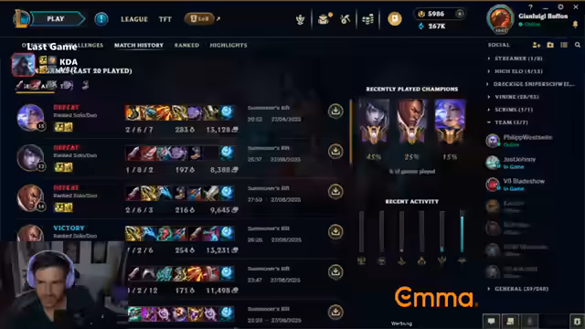 04:04:00Nach mehreren unangenehmen Verlusten wird eine ehrliche Selbsteinsicht vorgenommen. Der Streamer stellt fest, dass er verliert und in den Niederlagen keine Ahnung hat, was er hätte besser machen können. Dies deutet darauf hin, dass er sich aktuell auf einem Elo-Bereich befindet, der seinem Skilllevel entspricht. Die Niederlagen fühlen sich 'scheiße' an, weil sie nicht auf eigene Fehler, sondern auf unüberwindbare Hürden wie das Matchmaking oder Champion-Matchups zurückzuführen sind, was die Motivation und das Spielerlebnis stark negativ beeinflusst.