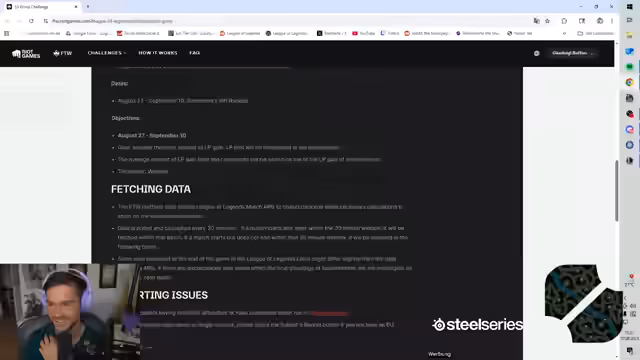 00:33:13Die eigentliche Themen des Streams wird vorgestellt: Die Season 3 Grind-Challenge von Riot Games, die vom 27. August bis 10. September läuft. Der Streamer startet mit 600 LP und seine Siege zählen für die globale Wertung. Auch die Siege der Community können seinen Score beeinflussen. Der Streamer gibt Tipps zur Teilnahme und warnt davor, bei einer zu hohen negativen Winrate teilzunehmen, da man sonst LP verlieren kann.