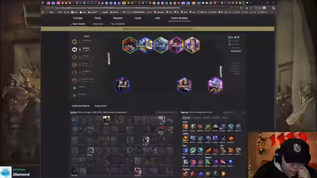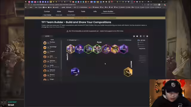 01:12:49Der Streamer nutzt die Endscreens der gestellten Spiele, um die gespielten Boards und Builds zu analysieren. Er sieht verschiedene starke Kombinationen, darunter Rise mit Shurima und Asia-Nasus, Lux mit Demacia und Yunara mit Ionia und Wukong. Er bewertet Yunara als sehr stark und zuverlässig. Auch Fizz mit Bart als Carry und Volibear als Bruiser-Kombo wurde gespielt. Dies gibt ihm eine gute Vorstellung davon, was im aktuellen Meta möglich ist.