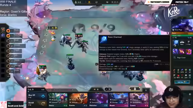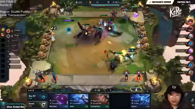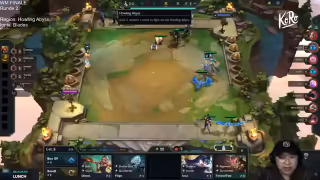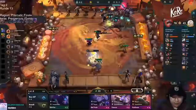 02:21:32Nachdem mehrere Runden überlebt wurden, wird Silan gefunden, was den Push auf Level 9 und das Erreichen von Rise ermöglicht. Es wird ein Staff of Still mitgenommen. Die endgültige Comp wird um Volibear herum aufgebaut, der auf Level 1 bereits extrem viel Schaden macht. Diese Entscheidung trifft man nachdem Saya und Li Chao in den letzten Runden mehrere erste Plätze geholt haben und eine starke Winstreak aufgebaut haben.