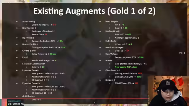 01:43:52Es gibt zahlreiche Änderungen bei Augments und Balancing. Wandering Trainer wird entfernt, was das Erreichen von PrismaticTraits erschwert. Economy Augments werden wichtiger. Die Chancen für hohe-Kosten-Einheiten wurden erhöht, aber die Erreichung von Level 10 wird notwendig für Prismatic Traits. No Scout und No Pivot sind jetzt teamweite Buffs. Einige populäre Augments wie Destiny++ und Another One werden entfernt.