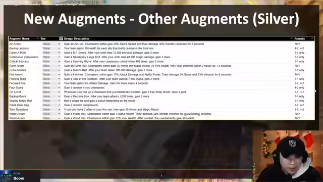 02:20:03Im Stream wurden die R-Hexfelder erklärt, die verschiedene Boni wie Attack Speed, Thunder (Armor Penetration) und andere Effekte bieten. Ein Boxing Lessons Augment gibt dem Team 30 AP für jeden Bruiser in der ersten Reihe, unabhängig davon, welche Einheit gespielt wird. Dies ermöglicht eine flexiblere Entscheidung im Late Game, ohne die Einheiten selbst zu binden.