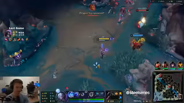 07:49:28Die Gewichtung verschiebt sich auf die Kontrolle wichtiger Spielobjekte wie des Drachen. Der Streamer betont die Drache als 'essenziell' für den weiteren Spielverlauf und plant gezielte Aktionen, um diesen zu sichern. Gleichzeitig gibt es technische Unannehmlichkeiten, wie ein 'verrücktes' Mikrofon, was den Streamer veranlasst, die Einstellungen zu überprüfen und anzupassen. Trotzdem wird der Fokus auf die Gameplay-Entscheidungen gelegt, wie etwa die Entscheidung, in eine bestimmte Lane zu wechseln, um Vorteile zu erzielen.