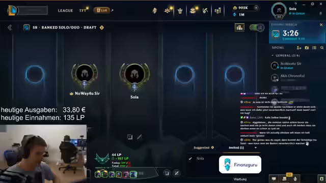10:47:36Der Streamer gibt einen detaillierten Kassensturz für den Tag bekannt. Die Gesamtkosten beliefen sich auf 153,80 Euro, aufgeteilt in Hotel (ca. 60 Euro), Technik (ca. 60 Euro) und Essen (ca. 35 Euro). Letzteres umfasste ein All-You-Can-Eat-Hot-Pot- und Grill-Restaurant. Nach einem weiteren abgebrochenen Game wird der Stream für den Tag beendet, da man sich unter 300 LP bewegt und das Ziel nicht erreicht hat.
