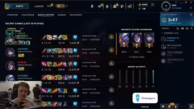 08:16:05Der Stream berichtet über den Fortschritt auf dem Taiwan-Server, wo man Emerald 3 erreicht hat, aber in Lobbies mit Master- und Challenger-Spielern antreten muss. Die Frustration über das LP-Cap auf 30 Punkte pro Sieg wird deutlich geäußert, da dies den Aufstieg verlangsamt. Die Diskussion über E-Sport-Wetten und deren Legalisierung durch Riot wird kurz angesprochen. Gleichzeitig wird der erste Challenger-Spieler im Team begrüßt, was als positives Zeichen für die eigene MMR gewertet wird, und technische Probleme am Mikrofon bleiben ein wiederkehrendes Thema.