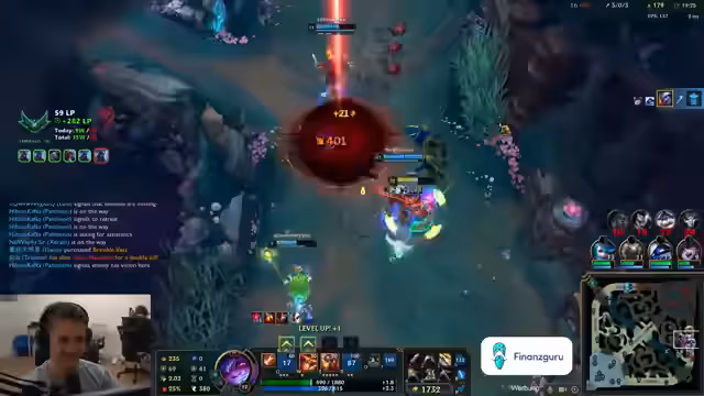 01:31:21Nachdem die Hardware-Probleme mit dem PC behoben waren, konzentrierte sich der Stream auf das Gameplay auf dem asiatischen League of Legends Server. Der Streamer spielt eine Vielzahl von Champions und Positionen, von Jungle bis Bot Lane. Besonders negativ erwähnt er den Champion LeBlanc, den er als 'Bullshit-Champion' bezeichnet, da dieser im early-game unangemessen stark sei und das Laneingefühl frustrierend mache. Er bemängelt auch die hohe Ping-Problematik auf dem Server, was seine Leistung erheblich einschränkt. Trotz der hohen Elo (High Diamond / Low Master) des Gegners gelingen dem Team einige Siege, bei denen er auch 'carrying'-Leistungen erbringt, jedoch kritisiert er oft mangelnde Kommunikation und strategische Fehler im eigenen Team.