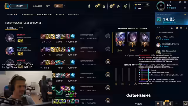 03:29:05Während des Streams treten wiederholt technische Schwierigkeiten auf, die den Ablauf stören. Das Hauptproblem scheint ein 'Packetloss' zu sein, der während des Spieins auftaucht und möglicherweise mit automatischen Steam-Downloads in Verbindung steht. Es werden Lösungsansätze wie das vollständige Beenden von Steam oder der Wechsel in den Offline-Modus getestet. Parallel dazu werden die steigenden Matchmaking-Wertungen (MMR) thematisiert. Es wird vermutet, dass aufgrund der hohen MMR bald Spiele gegen Challenger-Spieler stattfinden werden, was die erwartete Steigerung der Spielschwierigkeit unterstreicht.