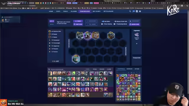 04:58:14Es wird betont, dass Jinx im Late Game nicht in die Mitte platziert werden darf, um nicht von Seraphine One-Shots getroffen zu werden. Die End-Comp soll Azul mit 6 Bastion, Tiny Team Rell, Jinx und Saya sein, wobei Saya auf Seraphine swappt. Tiny Team wird als das Beste angesehen. Es wird an Set 4 erinnert, als Ruko 5-Cost-Li-Sin Tanks wie Braum und Lissin kickte. Es wird erwähnt, dass es einen Bug mit Glove Item Swap gibt, bei dem eine Unit eine Runde in den zusätzlichen Team Platz bekommt. Es wird festgestellt, dass man 3x Eco-Augment hat, während der andere Jinx-Spieler 2x Combat hatte und beide Level 10 waren. Es wird überlegt, dass Golden Quest gepickt werden kann und man dann meistens Richtung Stargarden geht. Es wird analysiert, welche Items man hat und welche Richtung man einschlagen soll (Soulfighter, Jinx, Jenna). Es wird festgestellt, dass Power-Ups zu viele Probleme verursachen, aber das Set an sich gut ist. Der Fokus liegt auf Jinx und Kale.