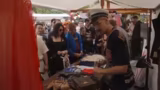 Verkauf von Artikeln und Geschäftigkeit am Stand