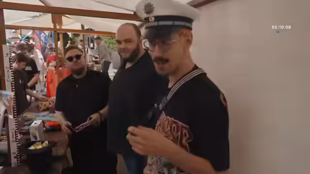 00:06:52Ein Besucher zeigt Interesse an einer Waffe für etwa 40 Euro. Es wird über ein Schwert und eine Sense aus Dungeon Keeper 2 diskutiert. Die Westen werden ab 300 Euro angeboten, aber es wird Verhandlungsbereitschaft signalisiert. Ein 11 Jahre altes Video von PietSmiet wird für einen unbekannten Preis angeboten. Der Chat schätzt den Preis des Videos auf 5.000 Euro, was jedoch als unrealistisch abgetan wird. Der Streamer schlägt 80 Euro vor, mit Unterschrift 100 Euro. Lootboxen werden für den Verkauf angeboten, wobei jeder nur eine Lootbox erwerben darf. Nach dem Kauf gibt es Unterschriften und Fotos. Ein Herr Heino wird begrüßt und darf eine Lootbox schütteln. Ein junger Mann kauft ein Schwert für 40 Euro und macht ein Foto. Der Drill-Sergeant-Hut, mit dem Kalle und Mori geärgert wurden, wird erwähnt. Eine Tasse wird für 100 Euro angeboten, und ein Ouija-Board für 60 Euro mit Unterschrift. Ein Song mit dem Thema Liebe und Frau Merkel wird für 5 Euro verkauft. Ein weiterer Song über eine Banane für Max wird ebenfalls für 5 Euro verkauft. Ein Besucher wird von Bröki gemalt, während er sich größte Mühe gibt, ein gelungenes Bild zu schaffen.