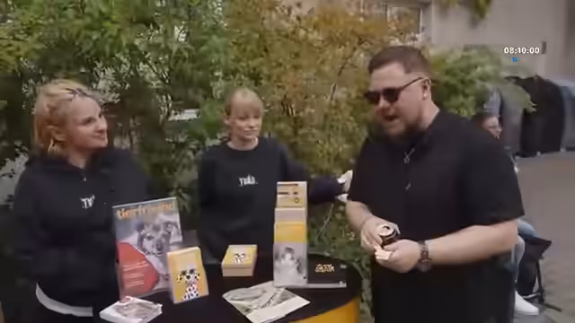 00:02:19Unter den besonderen Artikeln befinden sich ein komplettes Radler Outfit mit einer Salatgurke und Helm, eine Sense aus Dungeon Keeper 2, und das komplette Outfit des Hexenmeister von Andrahel. Für einige Gegenstände werden Auktionen durchgeführt, bei denen das Publikum mitbieten kann. Ein besonderes Highlight ist ein Gesangsauftritt, bei dem für 5 Euro pro Song ein Wunsch erfüllt wird, und eine Tätowierung per Farbspritzpistole für 5 Euro, die auch für Tiere gespendet wird.