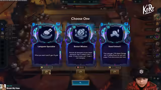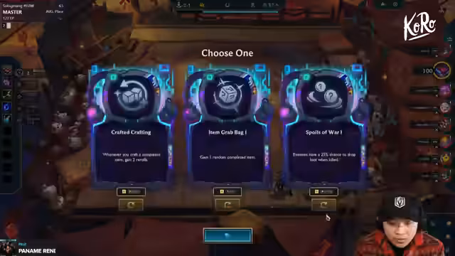 10:09:15Der Streamer konzentriert sich auf die späte Spielphase. Er überlegt, ob er mit einem Vintage-Equipment und Morrello oder Red Buff plus einer Komponente spielen soll. Er erwähnt auch die Möglichkeiten mit Nightrun, Syndicate und einem Economy Augment. Die Risiken, die mit diesen Strategien verbunden sind, werden erörtert, und der Streamer betont, dass er aufpassen muss, was seine Gegner bekommen, und dass er Gold benötigt, um seine Pläne umzusetzen.