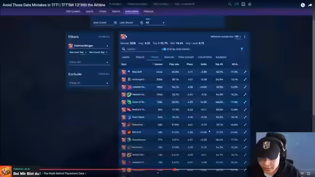 02:50:23Der Streamer diskutiert eine Formel zur Bewertung von Items basierend auf Playrate und Durchschnittsplatzierung. Er analysiert Items wie Archangel und Guardbreaker, wobei er zeigt, dass auch wenn ein Item gute Stats hat, die tatsächliche Auswirkung auf die Spielplatzierung gering sein kann, wenn es selten gespielt wird. Er betont die Wichtigkeit, diese statistische Relation bei der Item-Wahl zu berücksichtigen, um die besten Chancen auf Erfolg zu haben.