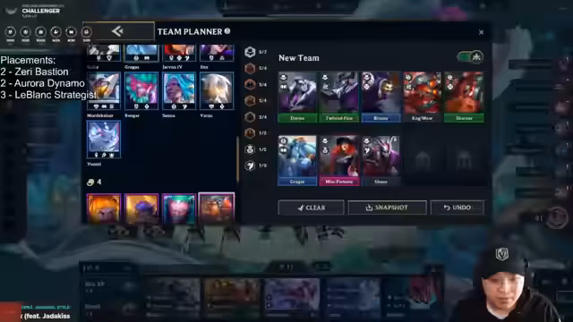 03:03:04Es wird eine detaillierte Analyse für den Champion Twisted Fate vorgestellt. Der Streamer diskutiert optimale Item-Kombinationen wie Rageblade und Gunblade, sowie die richtige Synergien mit anderen Champions wie Darius und Braum. Er geht auf die strategische Platzierung der Champions auf dem Spielfeld ein und wie diese die Effektivität von Fähigkeiten wie Red Card erhöht. Die Builds werden je nach Spielsituation und Gegner-Komposition angepasst.