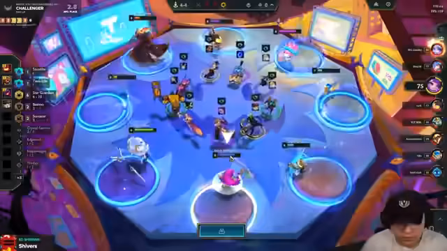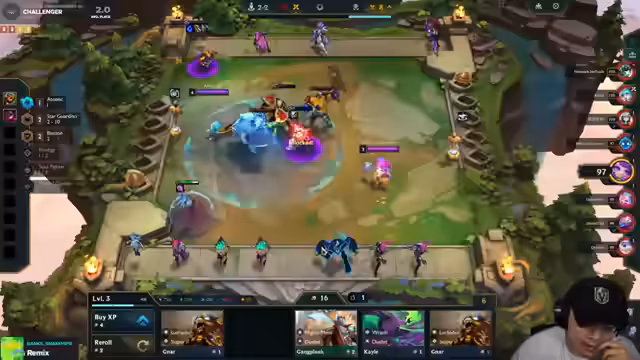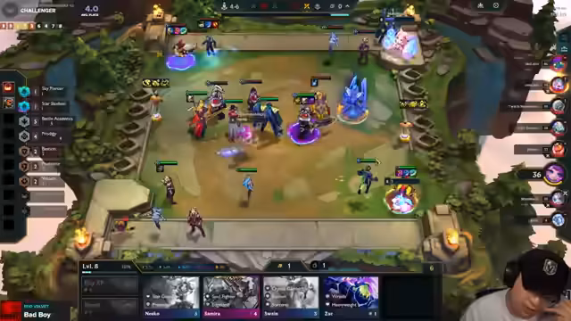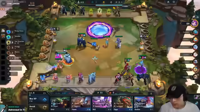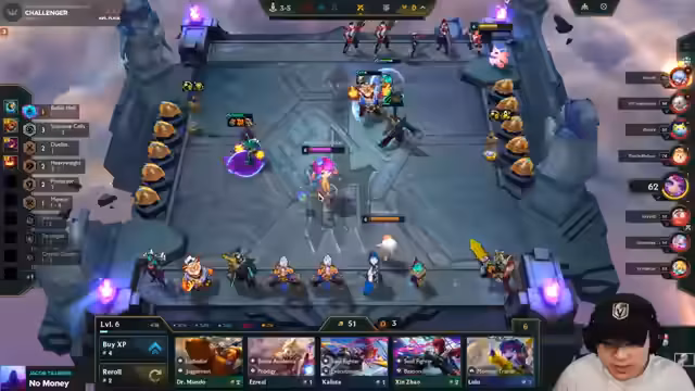 03:52:08Der Streamer plant eine Platzierung von 'Shen' vor 'Rell', um Gegner nach vorne zu locken. Er identifiziert ein starkes 'Yumi'-Build auf Gegnerseite und zweifelt an der Wirksamkeit seines 'Atomic'-Builds. Das Fehlen von 'Garen' wird als kritisch empfunden, um ein 'Stargarden'-Build zu verhindern. Das Item-Management wird chaotisch, mit 'viel Gold' aber schlechter Roll-Ergebnissen und dem Problem, vor dem Level-Up keine Fights gewinnen zu können.